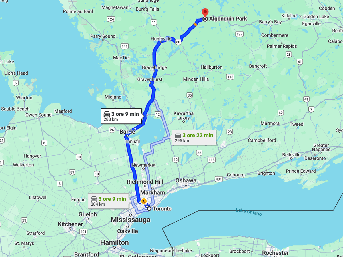Da Toronto all’Algonquin Park sono circa 300 km, per 3 ore abbondanti di auto.