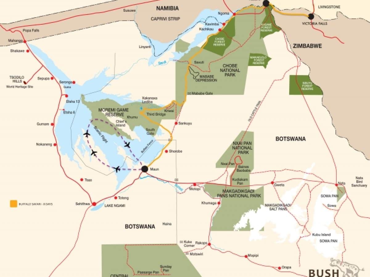 Botswana Buffalo Camping Safari è un itinerario in campi tendati mobili che parte da Maun per terminare a Victoria Falls, attraversando Moremi, Savute e il Chobe National Park.