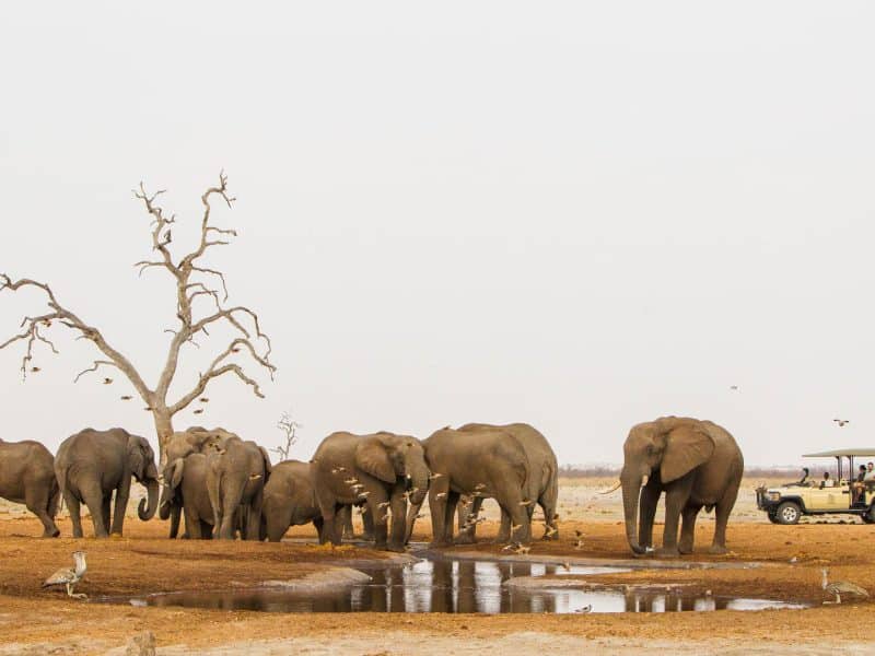 La più grande concentrazione di elefanti del mondo. I tramonti più infuocati dell'Africa australe. La stagione secca, da aprile ad ottobre, è la migliore per i safari fotografici.