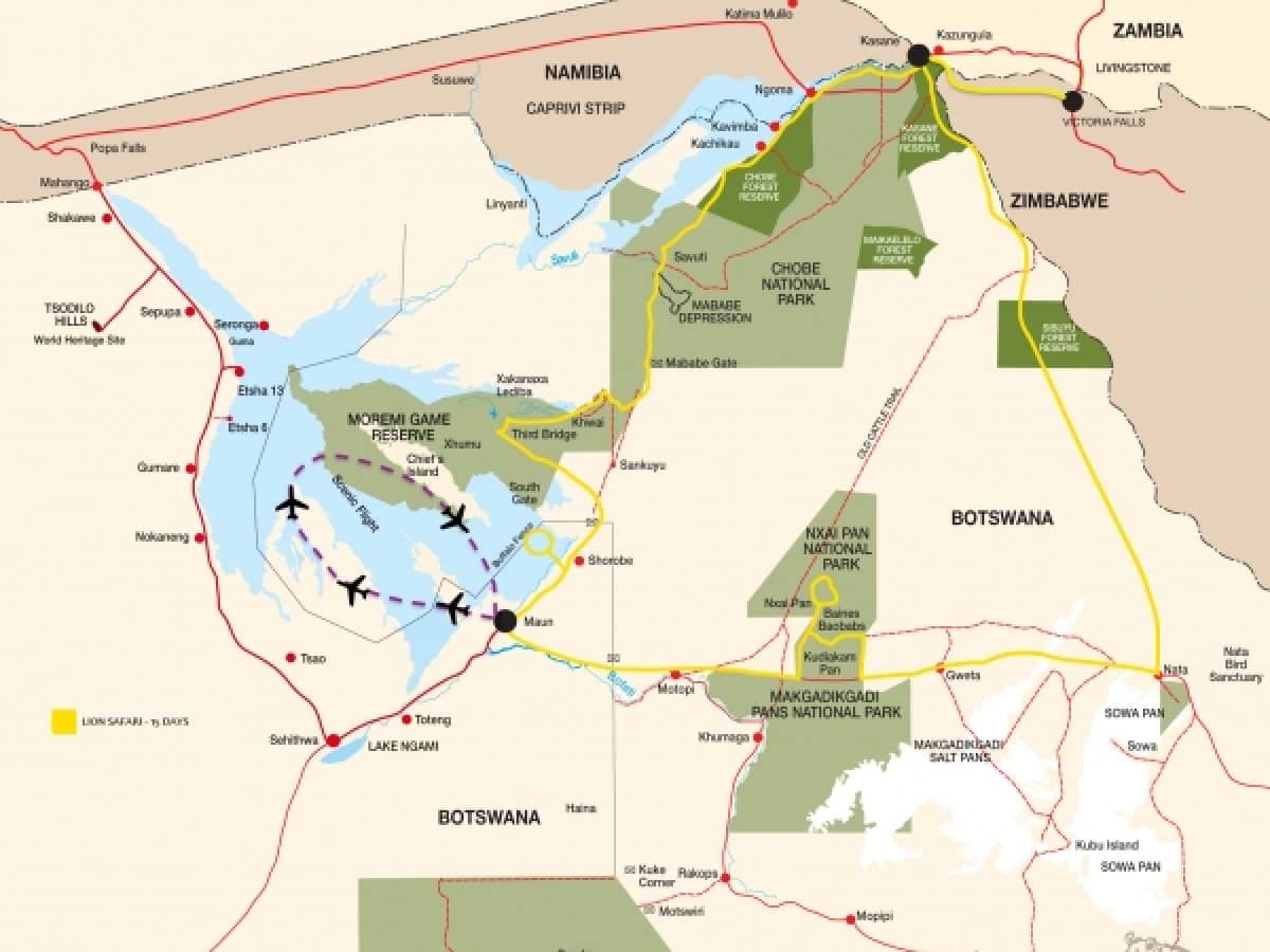 Botswana Lion Camping Safari è un itinerario in campi tendati mobili tra i più completi in Botswana. Attraversa molte tra le aree più belle e selvagge del Botswana, dal Nxai Pan al Delta dell’Okavango, dalla Moremi Game Reserve al Chobe National Park. Per concludere alle cascate Vittoria, una delle meraviglie del mondo.