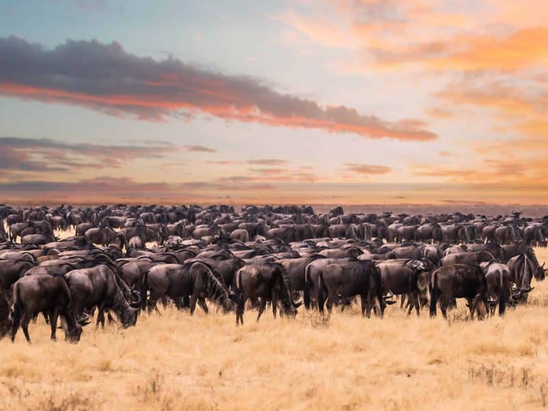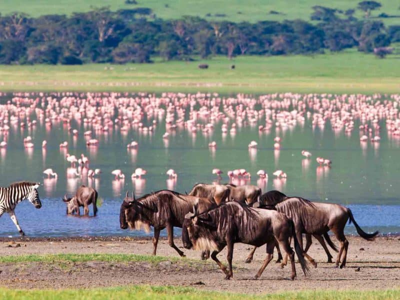 Safari nel Serengeti. che è il più famoso della Tanzania e uno dei più famosi al mondo. L’ecosistema Serengeti ospita più di 1.500.000 gnu, circa 300.000 zebre, 500.000 gazzelle di Thompson, più di 2700 leoni, 1000 leopardi, 500 ghepardi, enormi mandrie di elefanti, eland, impala, antilopi d’acqua, giraffe, struzzi, genette, e i corsi d’acqua sono popolati da coccodrilli e ippopotami; sono più di 400 le specie di uccelli.